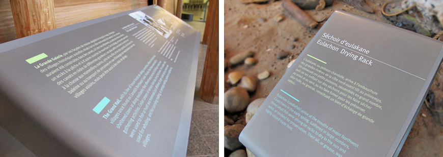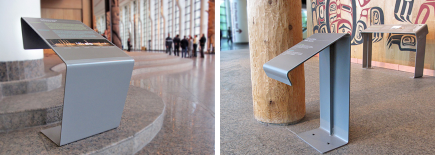 The museum's grand hall is home to one of the finest collections of totem poles and Pacific coast house facades in Canada. However, high visitor traffic and multipurpose use of the space were exposing these precious artifacts to risk of damage. The solution was to redesign signage and visitor information panels, which now serve as both protective barriers and interpretative supports.